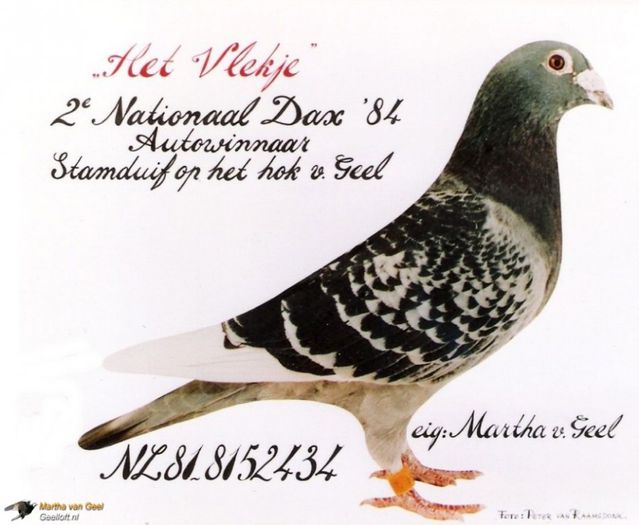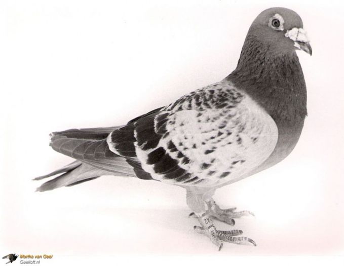 Porumbelul favorit Van Geel a fost intotdeauna ‘Dolle’, nu numai din pricina rezultatelor sale perfecte la cursele de lunga distanta ci si pentru ochii sai unici. ‘Dolle’ a demonstrat ca este unul dintre cei mai buni porumbei a tulpinii Jan Aarden. ‘Dolle’ a participat la 17 curse de lunga distanta si a castigat 17 premii.